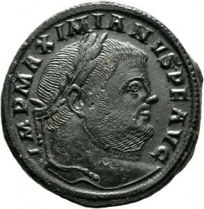 Obverse: IMP MAXIMIANVS P F AVG. Büste des Maximianus nach r., mit Lorbeerkranz.