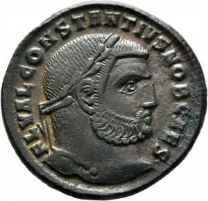 Vorderseite: FL VAL CONSTANTIVS NOB CAES. Büste des Constantius I. nach r., mit Lorbeerkranz.