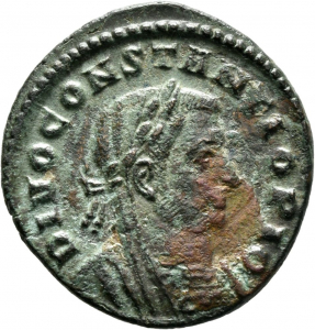 Vorderseite: DIVO CONSTANTIO PIO. Büste des Constantius I. nach r., mit Lorbeerkranz, über den Kopf gezogenem Mantel und Brustpanzer.